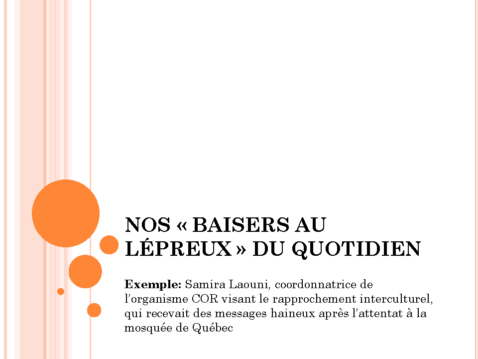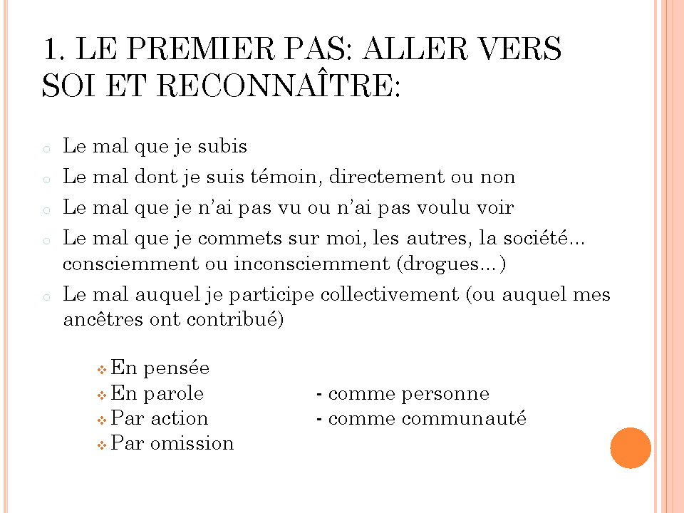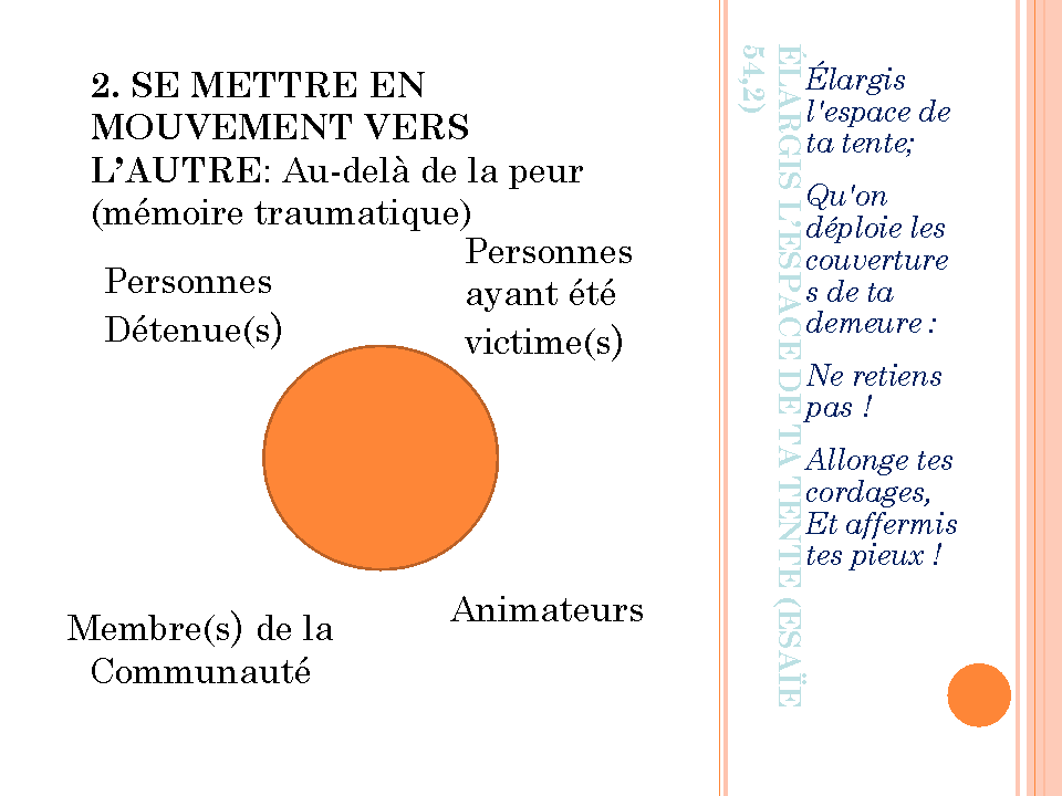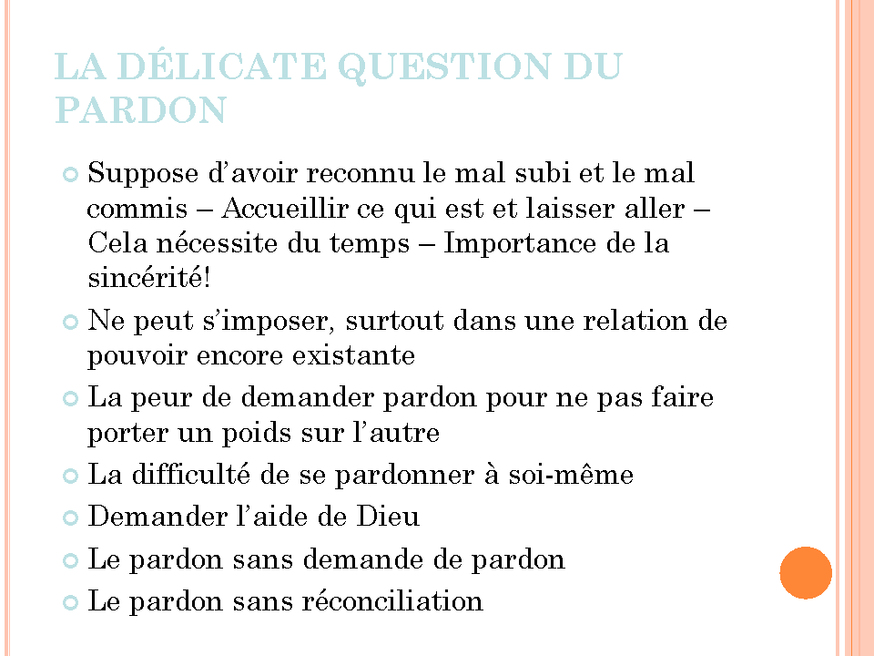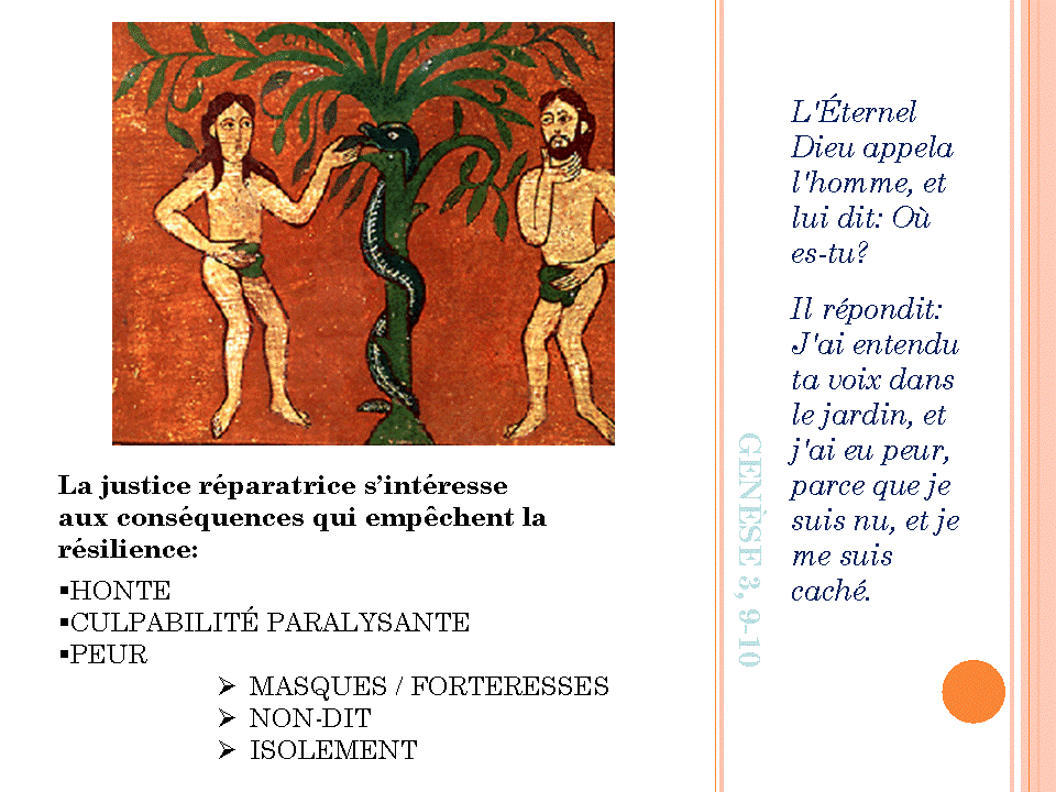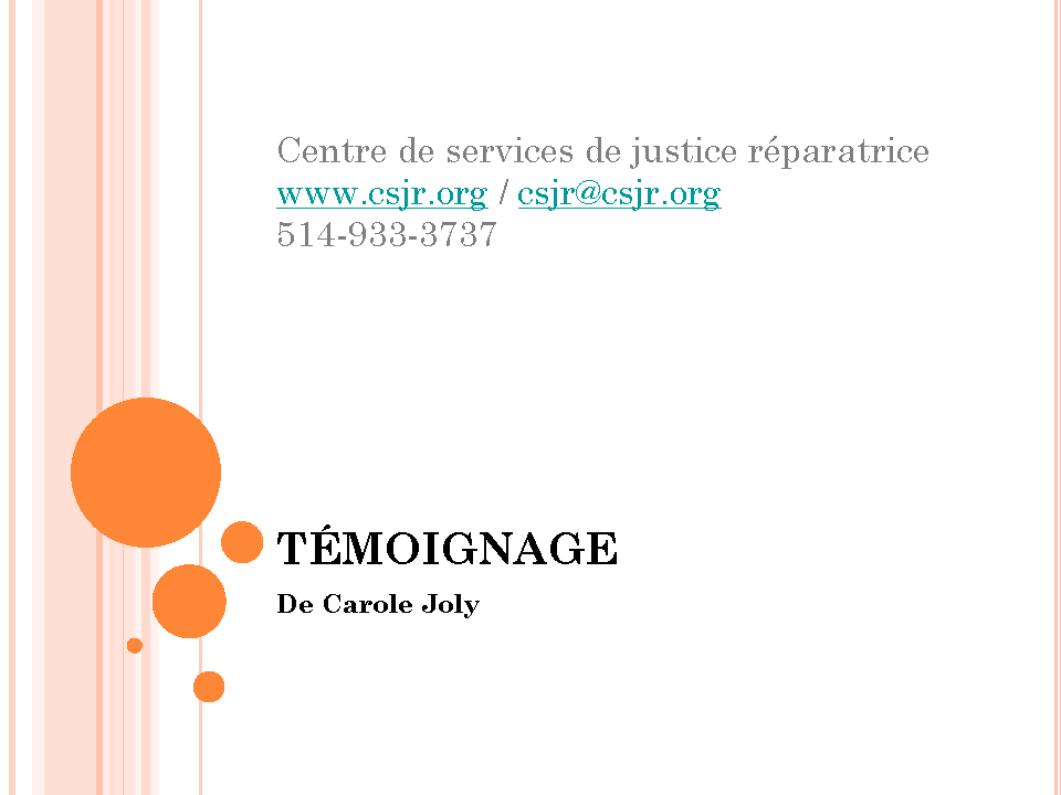 Carole Joly Carole Joly raconte quelle a été victime dabus sexuels de la part de son père et dun ami de son père pendant son adolescence. Elle a cherché à quitter son foyer rapidement à 18 ans en se mariant à un homme qui sest révélé alcoolique et toxicomane. Rendue dans la trentaine, elle a connu des séquelles des traumatismes vécus dans sa jeunesse. Mais son père est décédé sans quil y ait eu un échange avec lui au sujet des abus quelle avait subis. Cest la rencontre dEstelle Drouvin qui lui a permis dopérer un virage salutaire. Au Centre de services de justice réparatrice, elle a pu rencontrer un homme qui était incarcéré pour avoir abusé de sa propre fille. La démarche au Centre est volontaire, tant du côté des victimes que des auteurs dactes criminels. Les rencontres mettent en contact une victime, un auteur dun acte semblable à celui subi par la victime, une personne représentant le public et une personne animatrice. Carole Joly conclut en disant : « cest par la grâce de Dieu que jai été guidée à entreprendre ma démarche auprès du CSJR. Celui-ci ma soutenue dans ma recherche de paix intérieure. » |